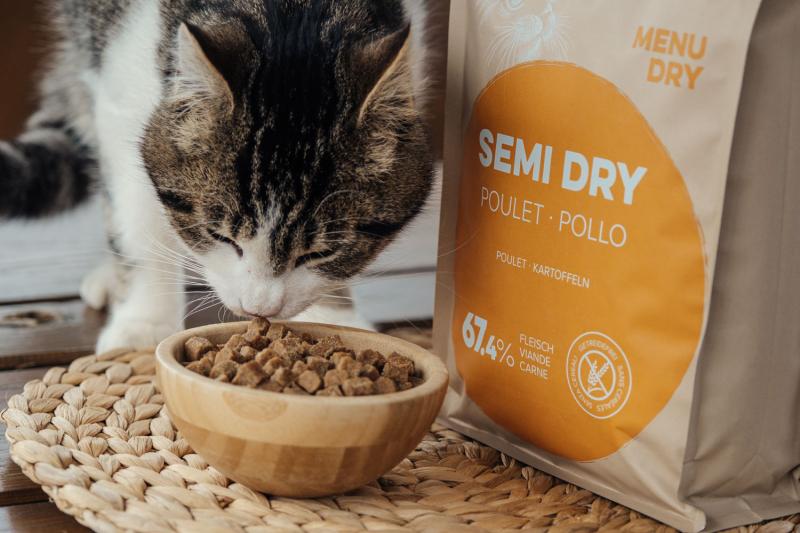 A causa del maggiore contenuto di umidità, il cibo semi-umido è più morbido e succoso del cibo secco. I pezzi di cibo sono morbidi, cosa che piace particolarmente a cani e gatti.